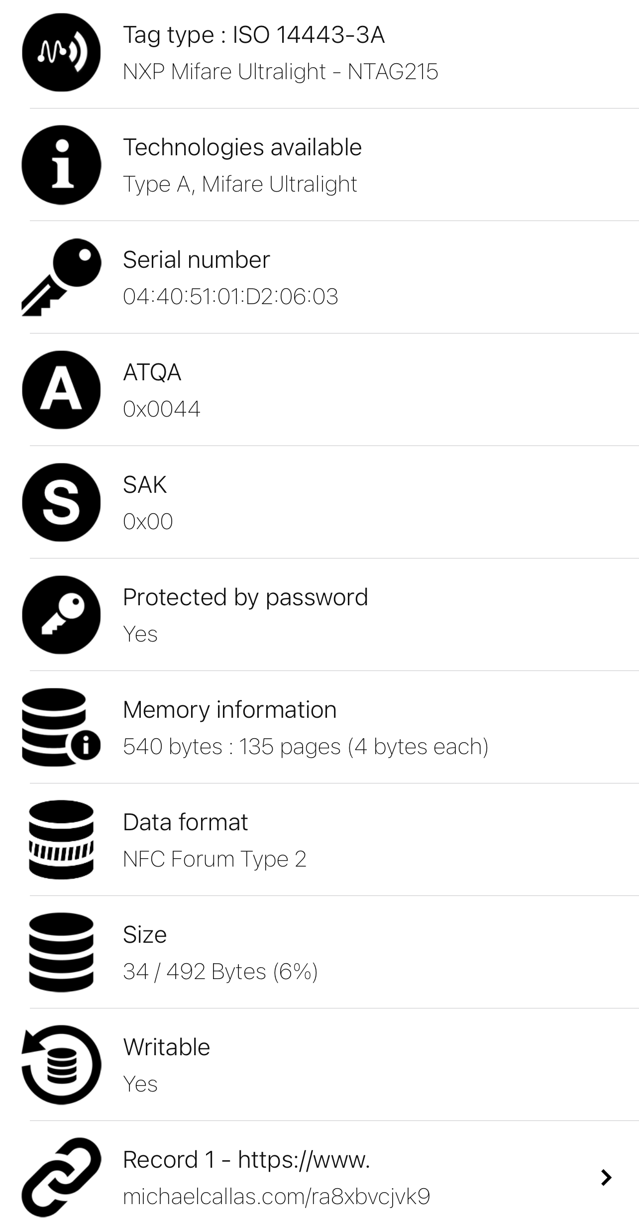 This painting also uses an NFC tag. NFC stands for Near Field Communication. Devices with NFC hardware can establish communications with other NFC-equipped devices as well as NFC “tags.” NFC tags are unpowered NFC chips that draw power from a nearby smartphone or other powered NFC device. They don't need their own battery or source of power. This NFC tag is directly linked to this private website. in order to access this website the physical painting must be scanned with an NFC enabled device. provided below is the encoded information of the NFC chip.