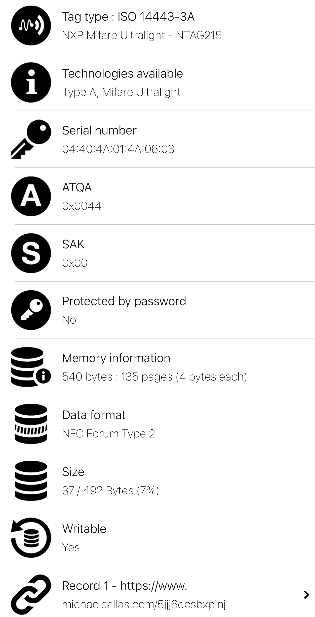 This painting also uses an NFC tag. NFC stands for Near Field Communication. Devices with NFC hardware can establish communications with other NFC-equipped devices as well as NFC “tags.” NFC tags are unpowered NFC chips that draw power from a nearby smartphone or other powered NFC device. They don't need their own battery or source of power. This NFC tag is directly linked to this private website. in order to access this website the physical painting must be scanned with an NFC enabled device. provided below is the encoded information of the NFC chip.